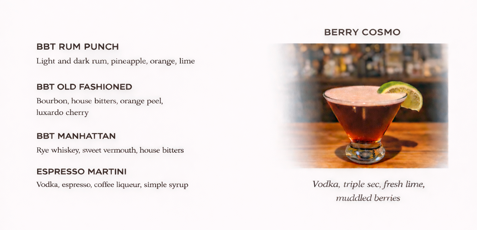 **To help keep our entertainment with no cover charge, all alcohol prices will increase by $0.50 from 7 pm to close on Fridays and Saturdays.